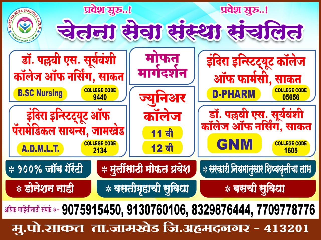 तेव्हा लवकरात लवकर आपला प्रवेश निश्चित करावा अधिक माहितीसाठी संपर्क-9075915450, 9130760106, 8329876444, 7709778776