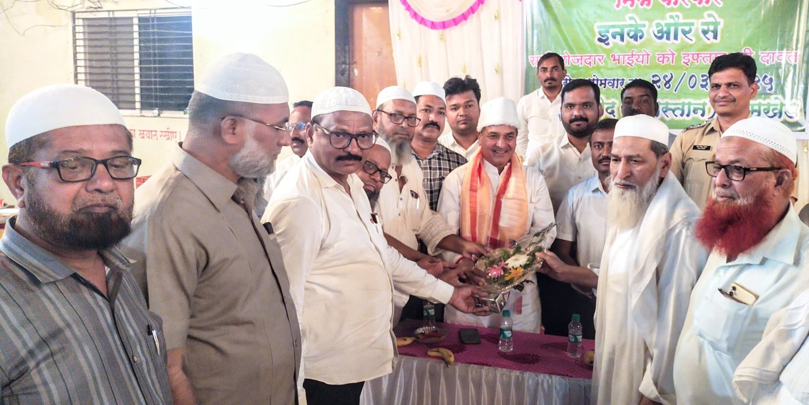 मक्का मस्जिद (कब्रस्तान) येथे झालेल्या या इफ्तार सोहळ्यास मुस्लिम पंच कमिटी अध्यक्ष अजहर काझी, तहसीलदार गणेश माळी, पोलीस निरीक्षक महेश पाटील, नगरसेवक अमित चिंतामणी, उद्योजक आकाश बाफना ; ॲड शमा हाजी कादर ; अझहर काझी ; शेरखान पठाण ;साहित्यिक गोकुळ गायकवाड, मुक्तार सय्यद ; इम्रान कुरेशी ; मंजुरभाई सय्यद ; फरमान भाई शेख ; इस्माईल सय्यद ; गफ्फार सय्यद ; आबेद खान ; हाबीब मास्टर ; तसेच विविध पक्ष-संघटनांचे पदाधिकारी आणि मुस्लिम समाज बांधव मोठ्या संख्येने उपस्थित होते.यावेळी बोलताना पोलीस निरीक्षक महेश पाटील यांनी रमजान हा केवळ धार्मिक उपासना नव्हे तर समाजाला एकजूट ठेवणारा महिना आहे. रोजामुळे मनाची आणि शरीराची शुद्धता होते. समाजात शांतता राखण्यासाठी प्रत्येकाने जबाबदारीने वागले पाहिजे.