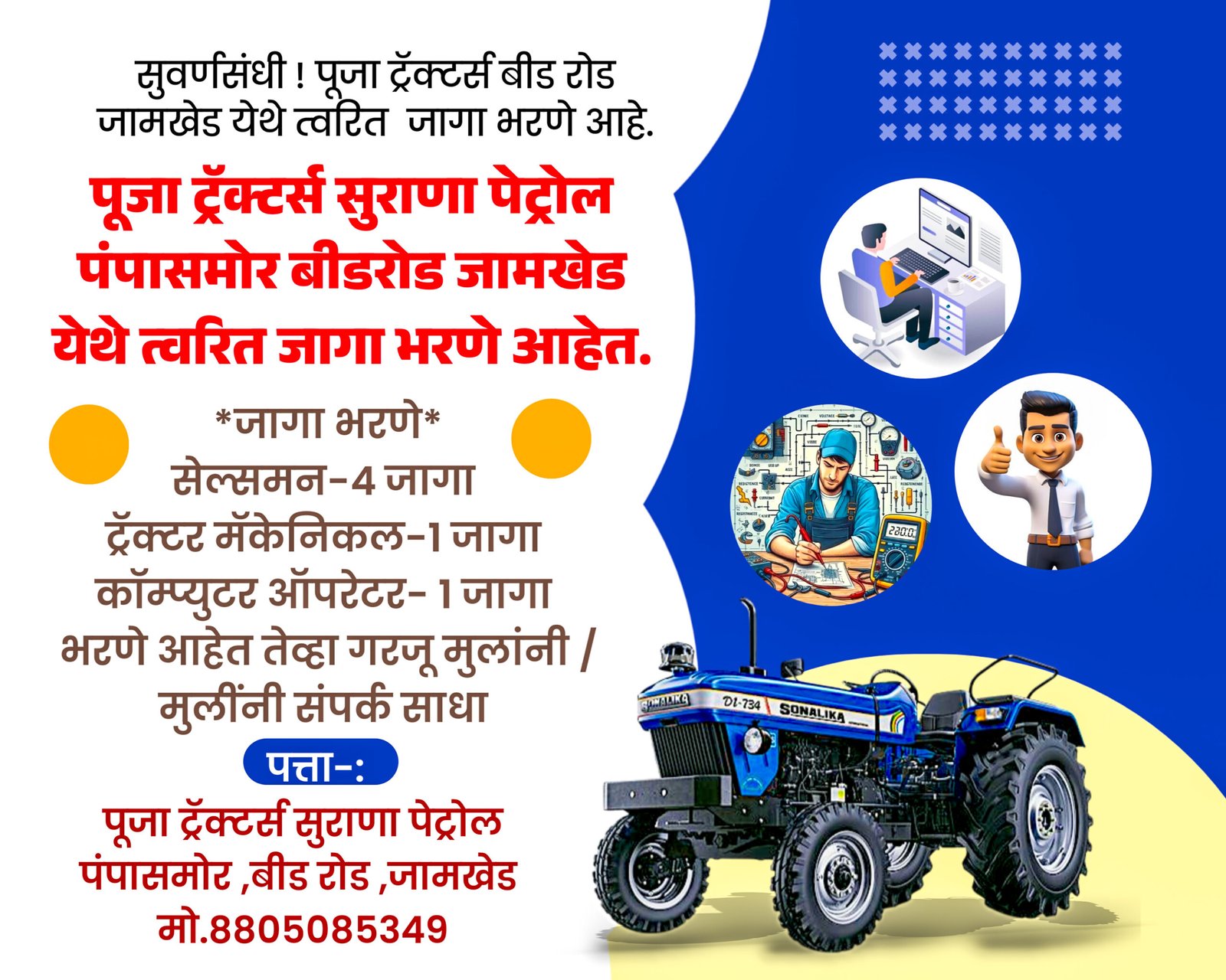 सुवर्णसंधी ! पूजा ट्रॅक्टर्स बीड रोड जामखेड येथे त्वरित जागा भरणे आहे.
