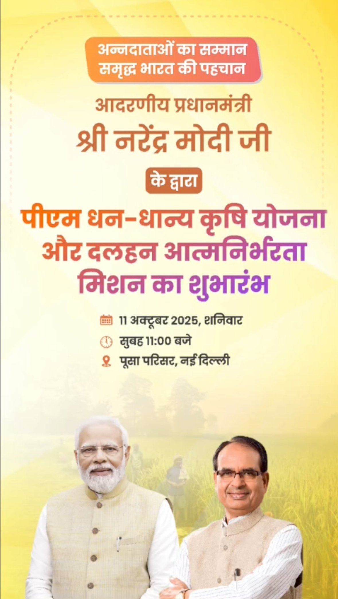 ‘पी एम धन धान्य’ कृषी योजनेचे पंतप्रधान नरेंद्र मोदी यांच्या हस्ते आज (शनिवारी) सकाळी 11 वाजता दिल्लीत योजनेचा प्रारंभ होणार व पीएम दलहन आत्मनिर्भरता मोहिमेचा आज प्रारंभ